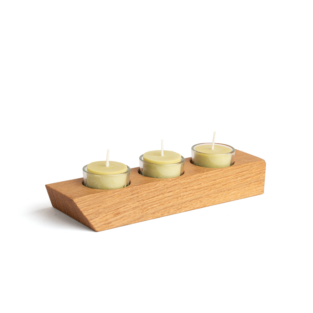 Der Halter bietet Platz für drei Teelichter im wiederverwendbaren Glaseinsatz – inklusive handgegossener Rapswachskerzen.