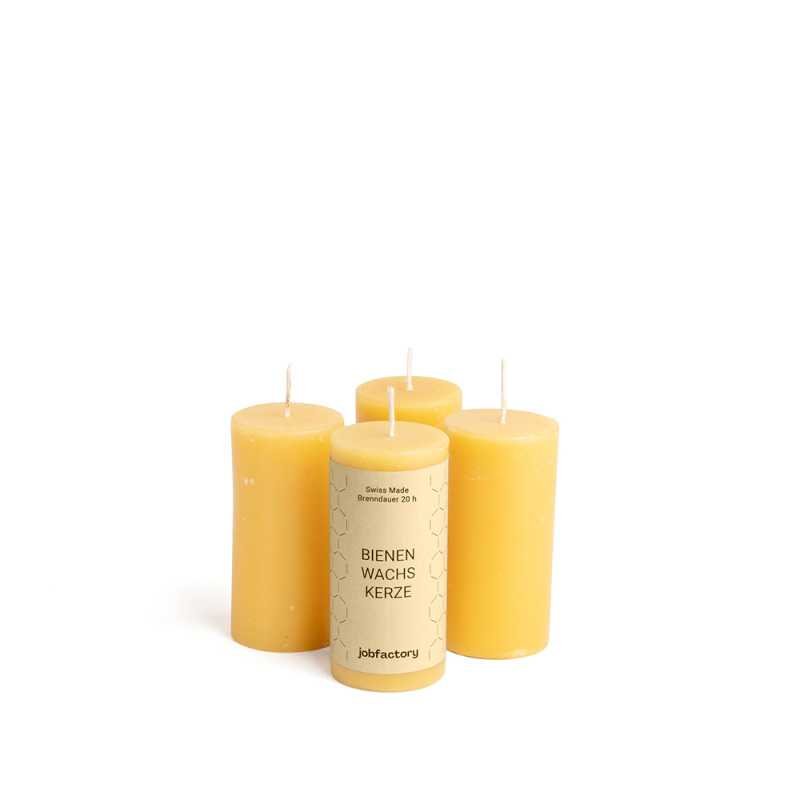 Bienenwachskerzen – Bienenwachs entsteht in den Wachsdrüsen der Arbeitsbienen, die kleine Wachsplättchen ausscheiden. Diese Plättchen werden von den Bienen gekaut und mit Speichel vermischt, wodurch sie weich und formbar werden. Das so produzierte Wachs wird zum Bau der Waben genutzt. Dieses Wachs wird gesammelt und ohne Chemikalien gereinigt, wodurch es natürlich und frei von mechanischen Verunreinigungen bleibt. Unsere Kerzen bestehen aus 100% reinem Bienenwachs und werden in der Jobfactory von Hand gefertigt.